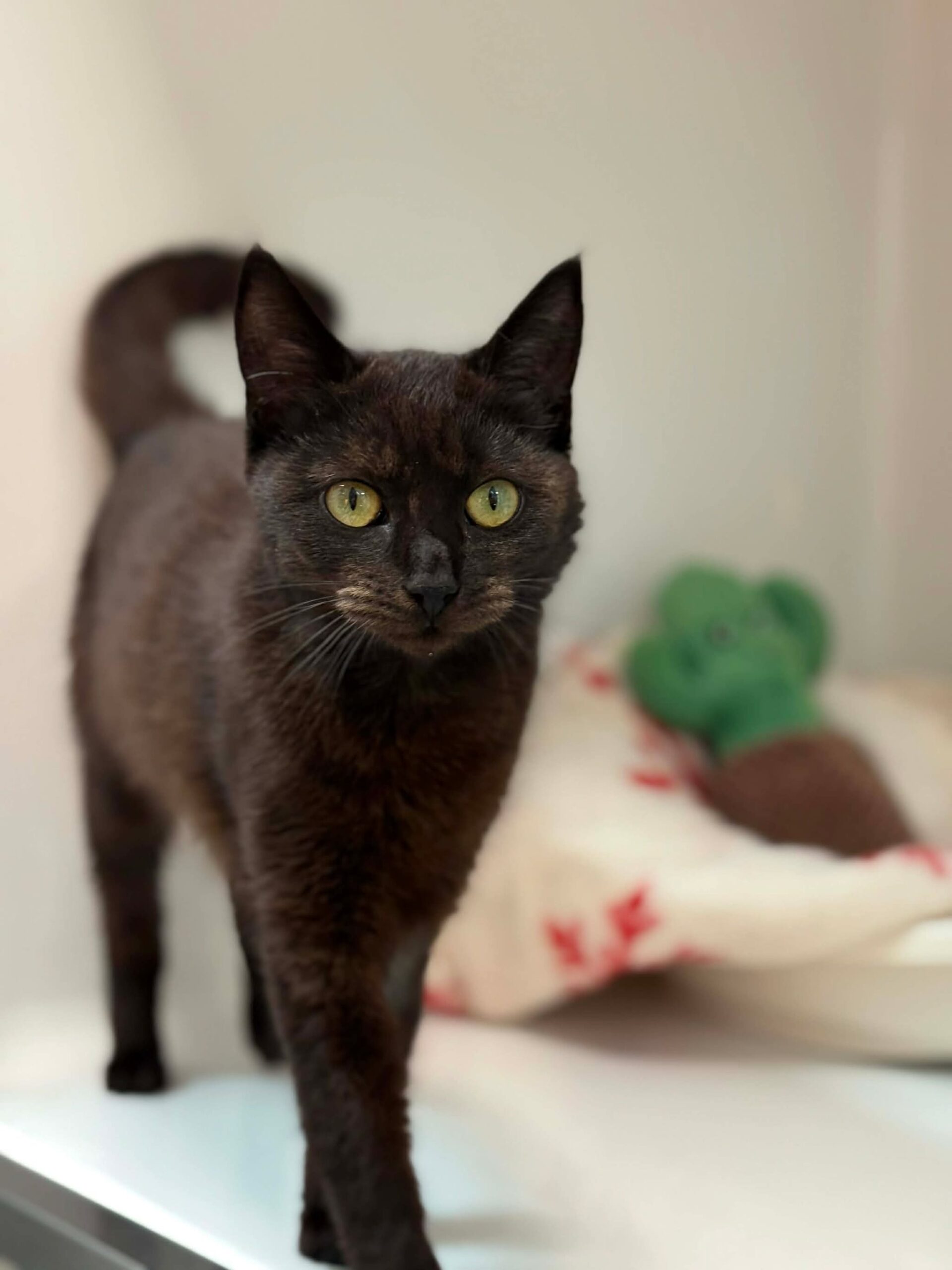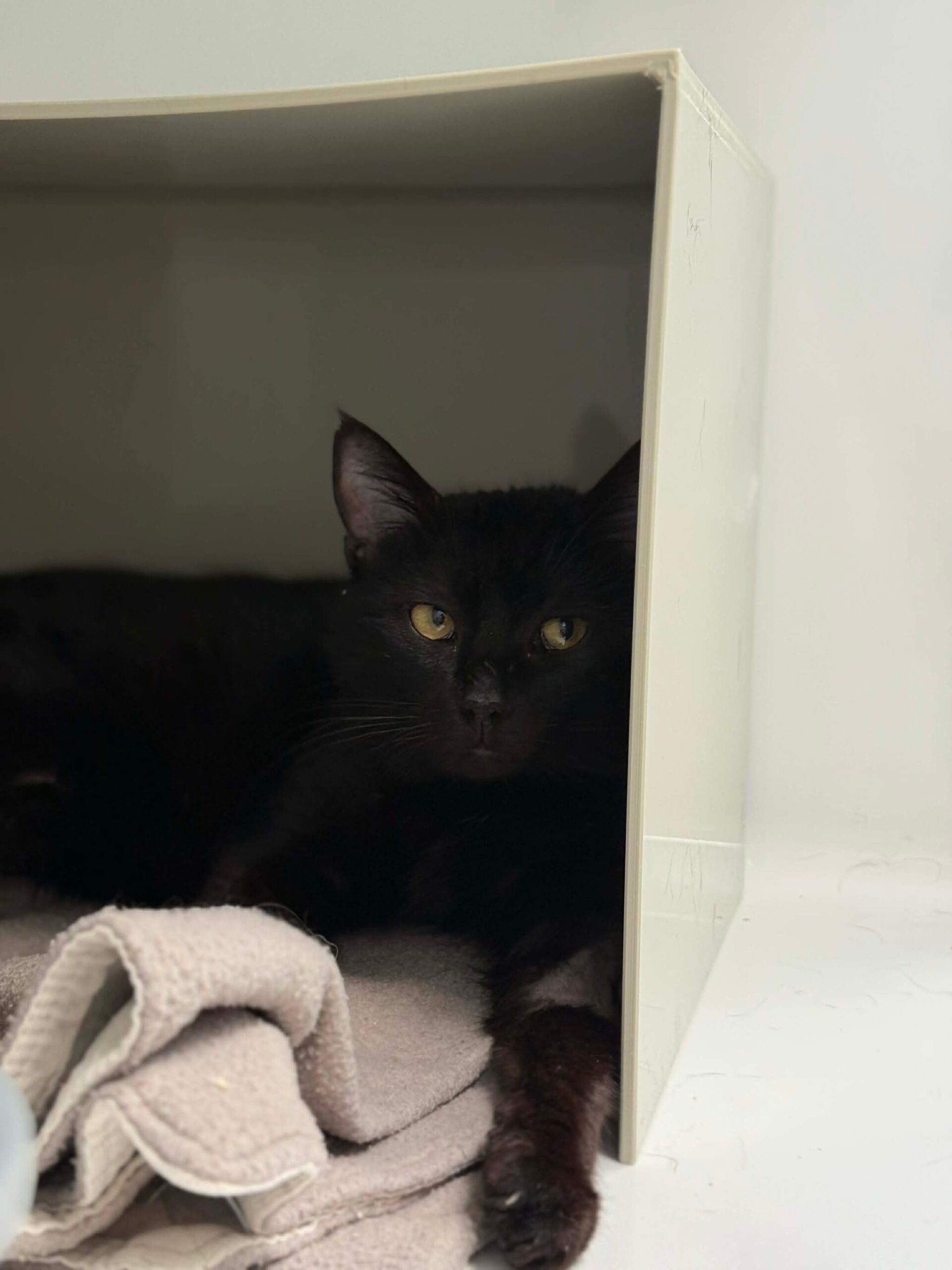 C’est une chatte timide, mais sociable et douce une fois en confiance.