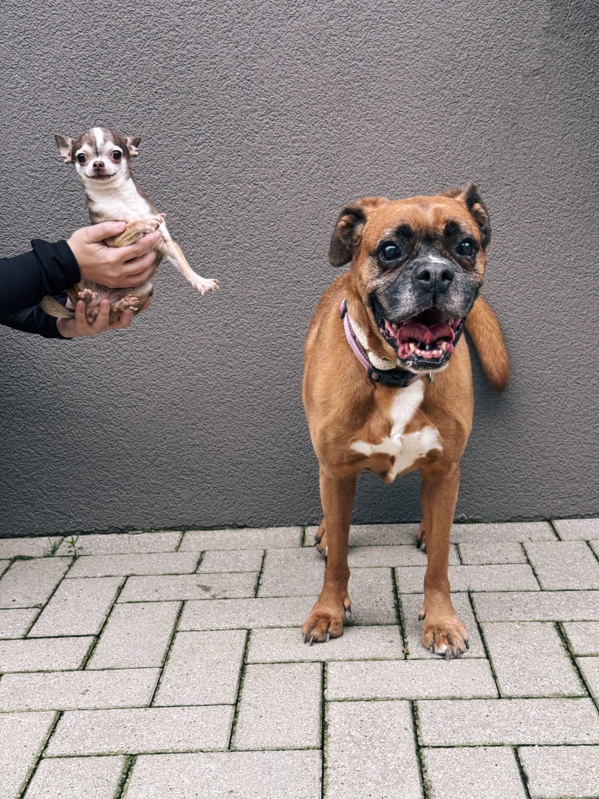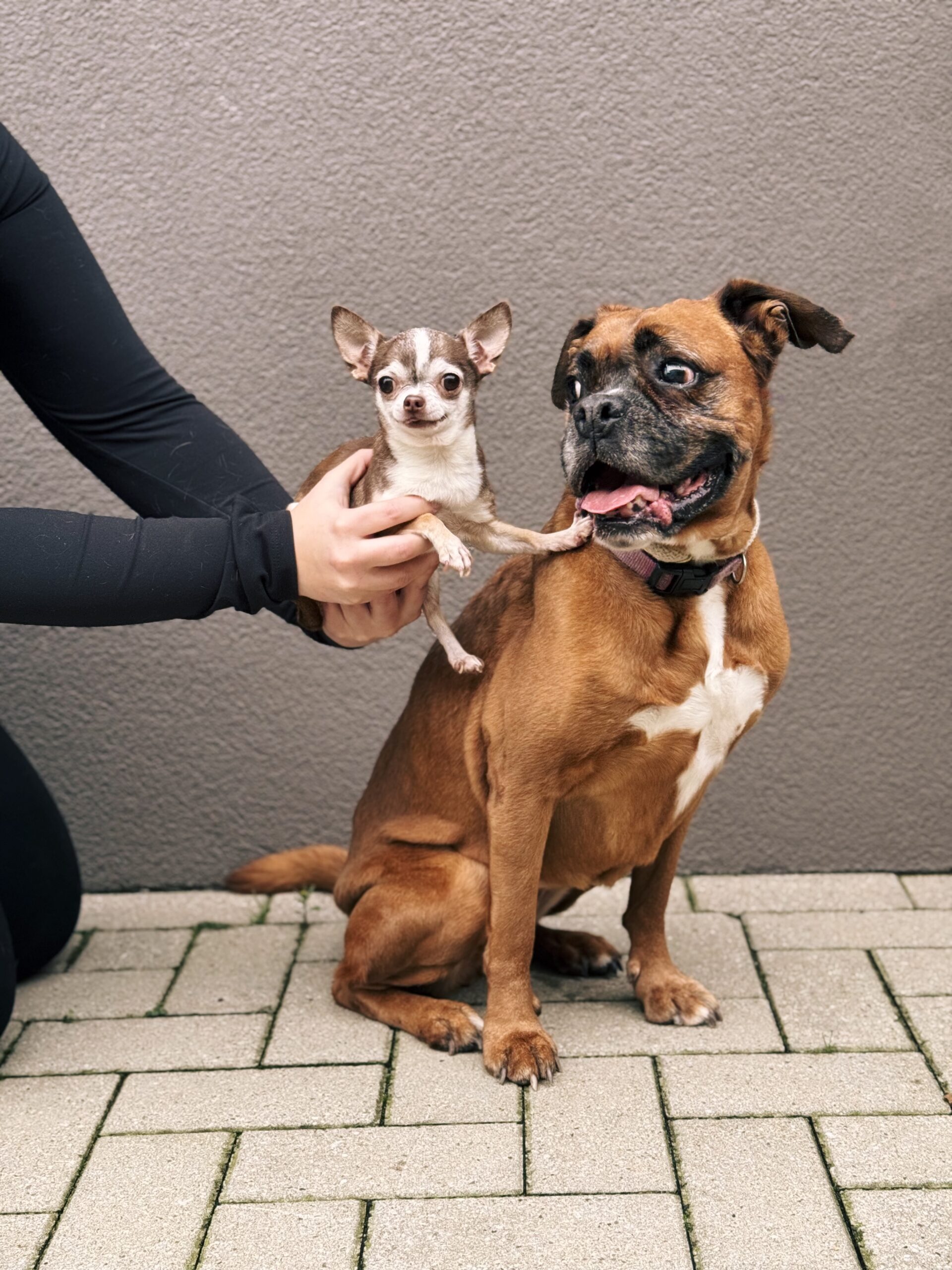 Voici Nala, magnifique Boxer au regard tendre, et Lili, adorable chihuahua au cœur en or. À 10 ans, ces deux adorables chiennes, une Boxer et une chihuahua, partagent une complicité rare et touchante. Leur histoire n’est pas simple : leur propriétaire, malheureusement expulsé, les a placées en pension… et n’est jamais revenu les chercher. Après plus de deux mois sans nouvelles, la pension nous a contactés pour que nous prenions le relais et leur offrions une nouvelle chance.